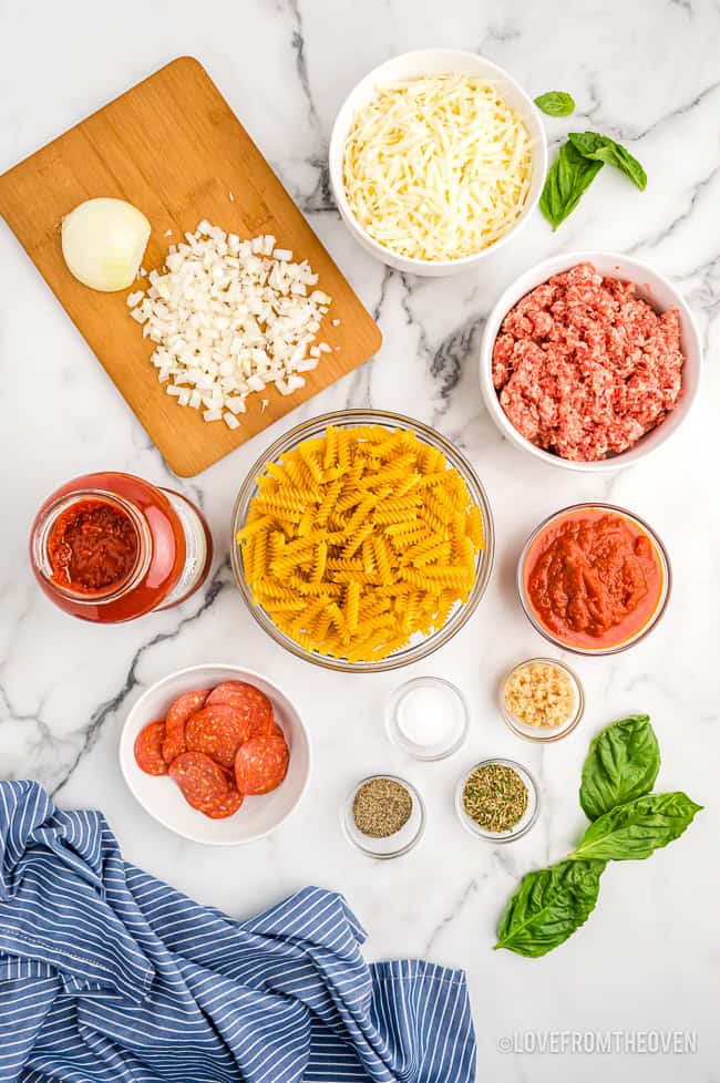 The process is simple: cook pasta (like rotini, penne, or ziti) and toss it with marinara or pizza sauce. Layer it in a casserole dish with shredded mozzarella, Parmesan, and plenty of pepperoni. Some recipes add Italian sausage, bell peppers, mushrooms, or onions for extra flavor.