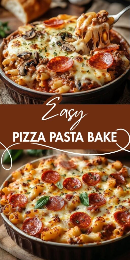 Imagine tender pasta swimming in a rich, oregano-spiked marinara sauce, just like your favorite pizza base. Now, picture it studded with classic toppings—spicy pepperoni that curls into crispy cups, earthy mushrooms, or vibrant bell peppers. The entire creation is then blanketed under a generous layer of gooey, melted mozzarella cheese, baked until golden-brown and bubbling at the edges. It’s the satisfying heartiness of a pasta bake combined with the unmistakable joy and flavor profile of a fully loaded pizza. Every spoonful delivers that perfect bite: savory sauce, stretchy cheese, your chosen toppings, and comforting pasta all at once.