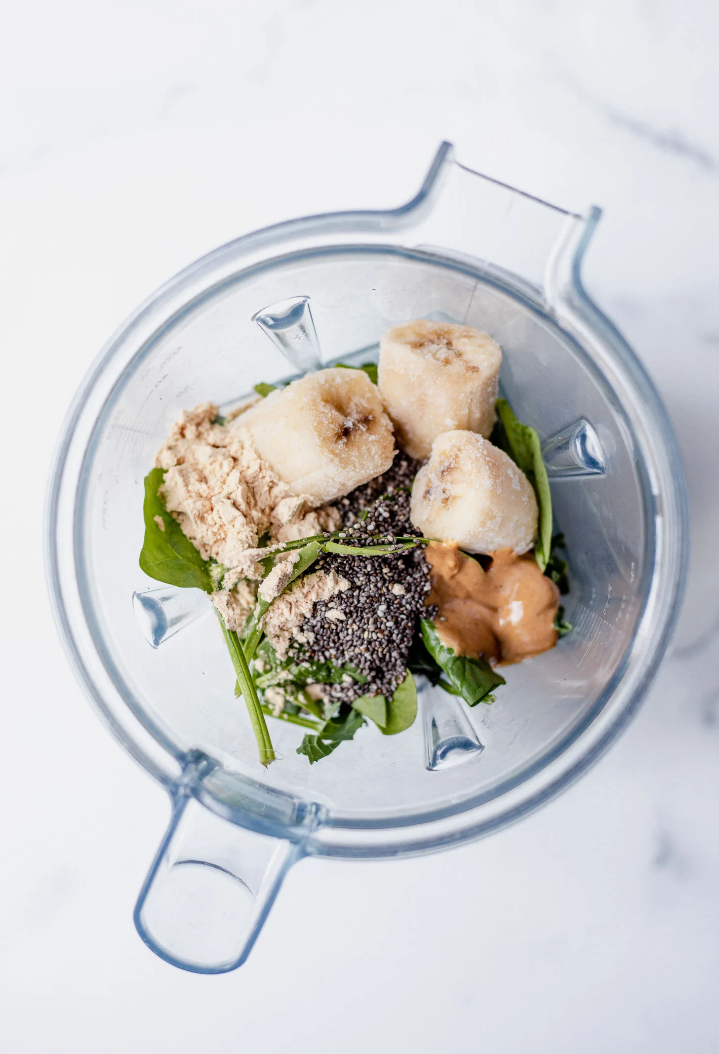 Start with the liquids first (like milk and yogurt), then add frozen fruit, greens, nut butter, seeds, and finally the protein powder. This order helps everything blend more smoothly.