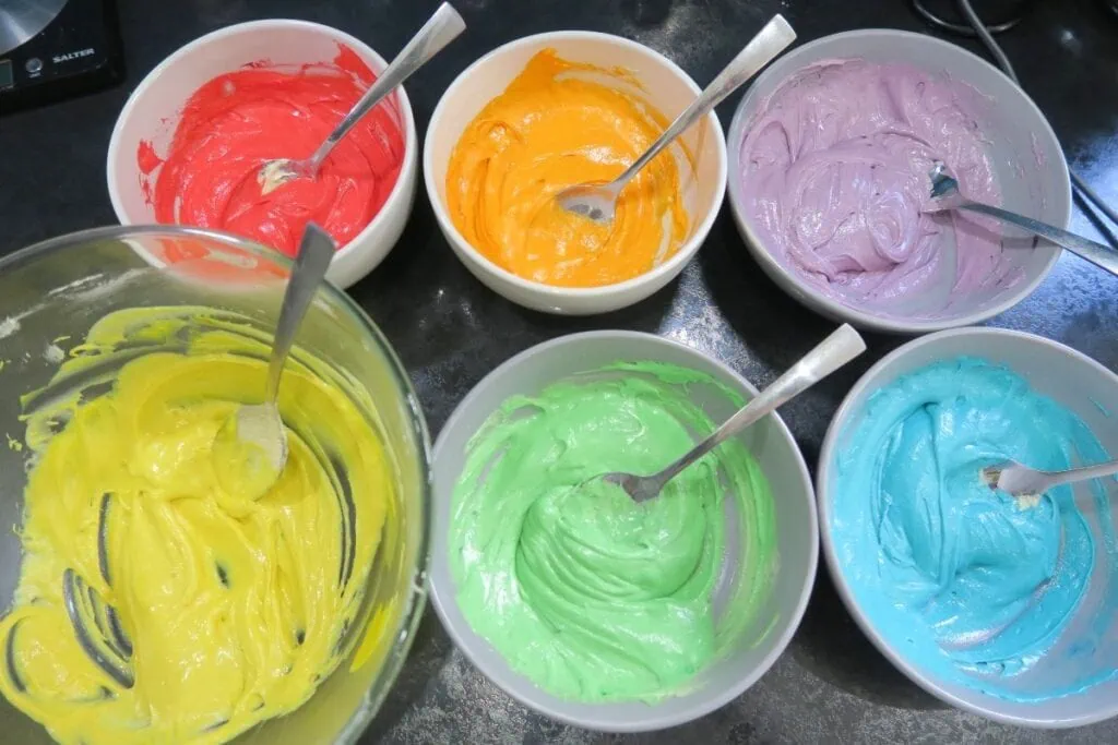 - If you don’t have six small bowls, mix and color the batter one color at a time.