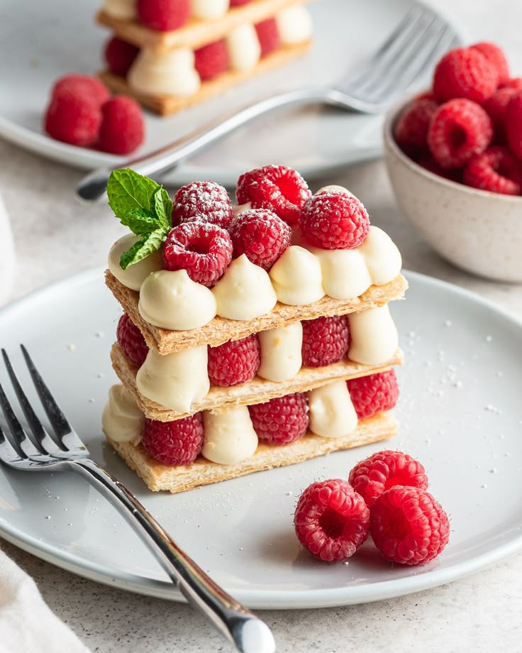 Often, the top layer is dusted with powdered sugar, drizzled with icing, or decorated with fresh raspberries for visual appeal. Some versions use a glaze or fondant for that classic mille-feuille finish.