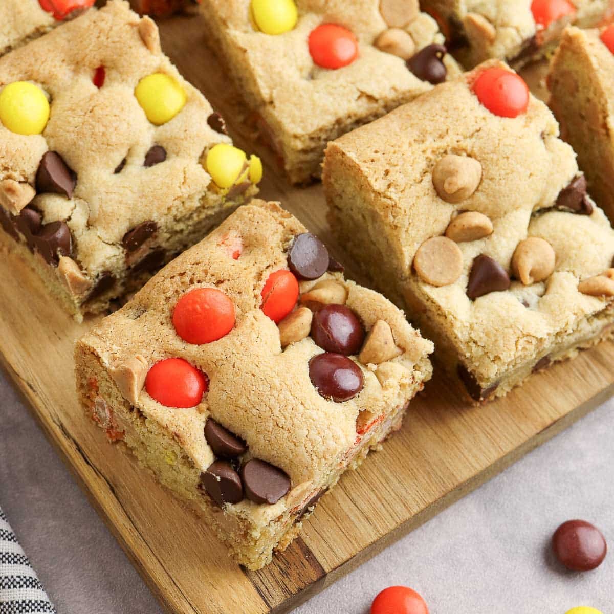 Reese’s Pieces cookie bars stand out because they combine the classic flavor of chocolate chip cookie dough with the rich, peanut buttery crunch of Reese’s Pieces.