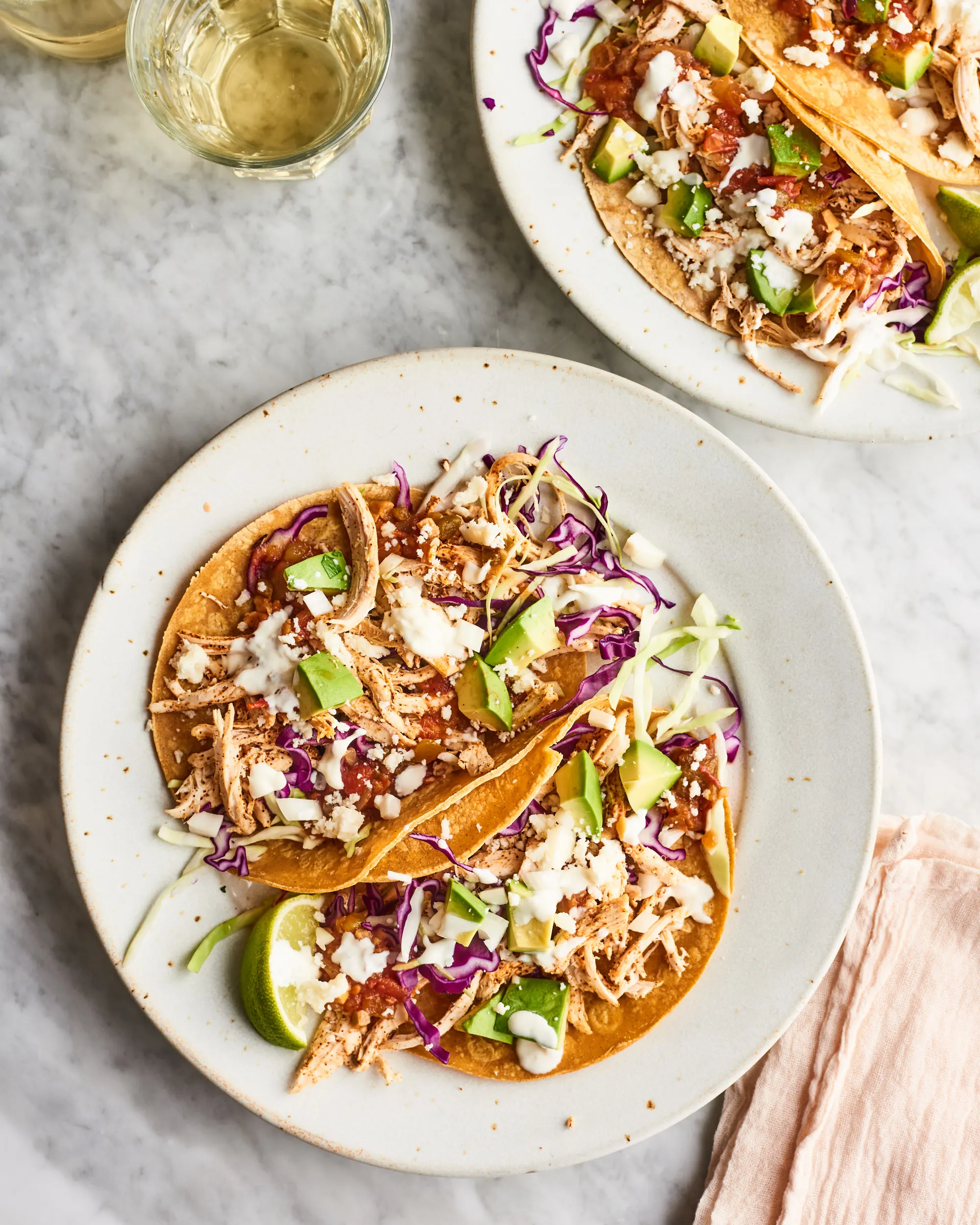 Simply shred the chicken and warm it with taco seasoning, then load into soft or crispy taco shells. Finish with fresh ingredients like shredded lettuce, diced tomatoes, cheese, avocado, and a dollop of sour cream or salsa.