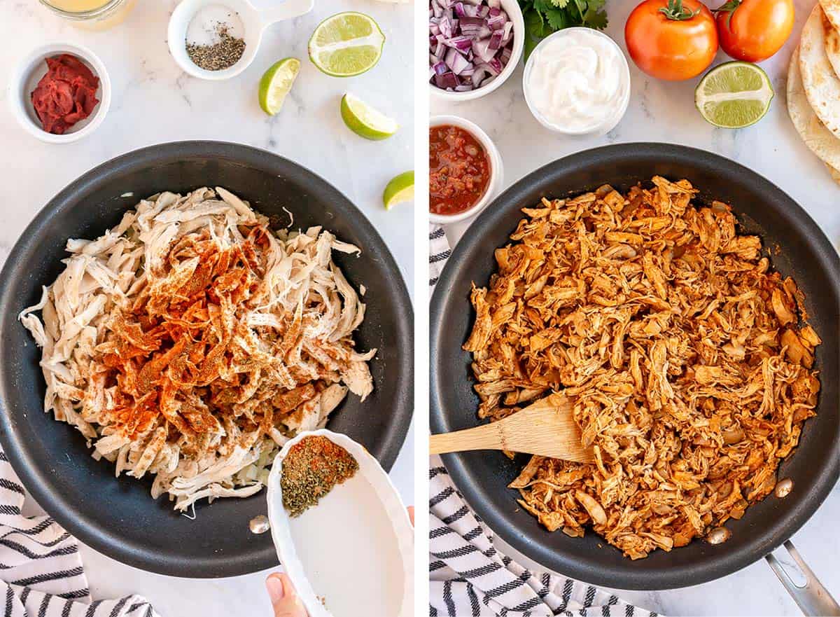 Toss in the shredded chicken and mix until evenly coated with the spice blend.