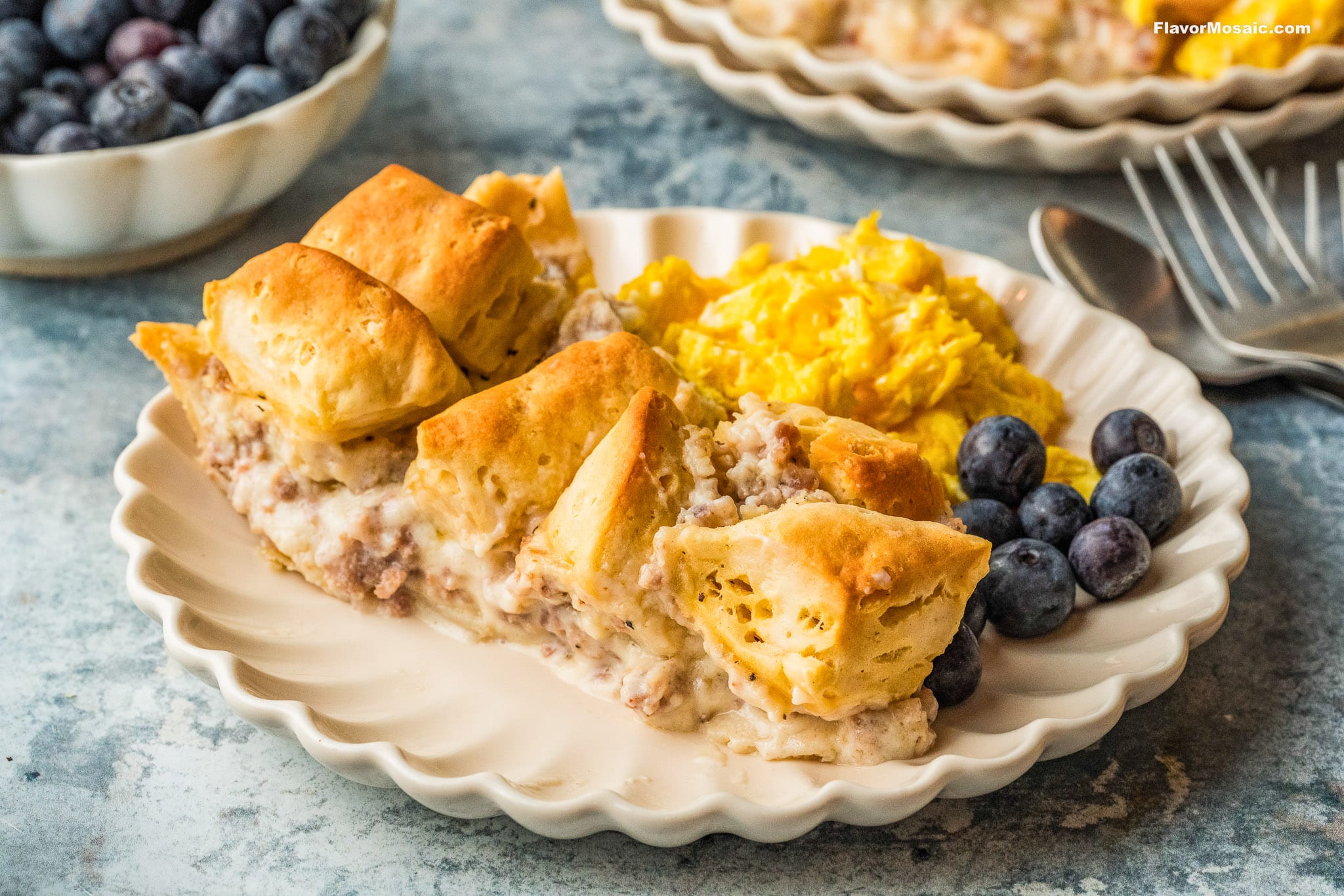 This dish is a twist on classic biscuits and gravy, with layers of buttery biscuits topped with rich, peppery sausage gravy, then baked to perfection. It’s great for weekend brunch, holiday mornings, or meal prep—and pairs beautifully with eggs, fresh fruit, or a cup of coffee!