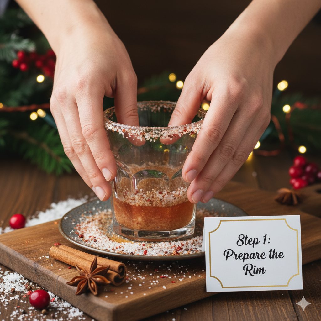 Mix sugar and cinnamon on a small plate. Rub the rim of your glass with a lime wedge and dip it into the mixture to create a sweet-spiced edge. This adds extra flavor and a festive look. -