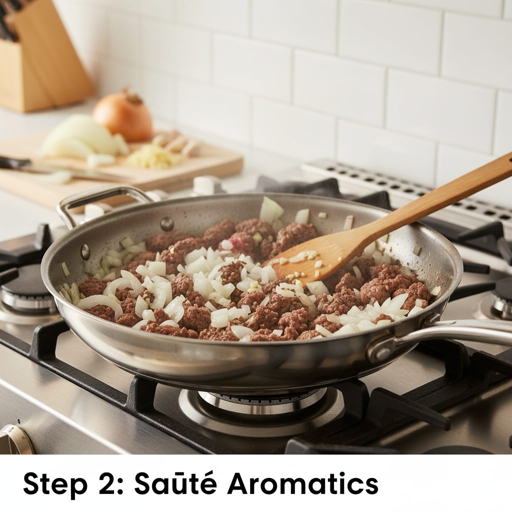 - Layer the Flavor Base: After browning the meat, sauté your aromatics—typically diced onion and garlic—in the same pan. This allows them to absorb the residual meaty flavor.