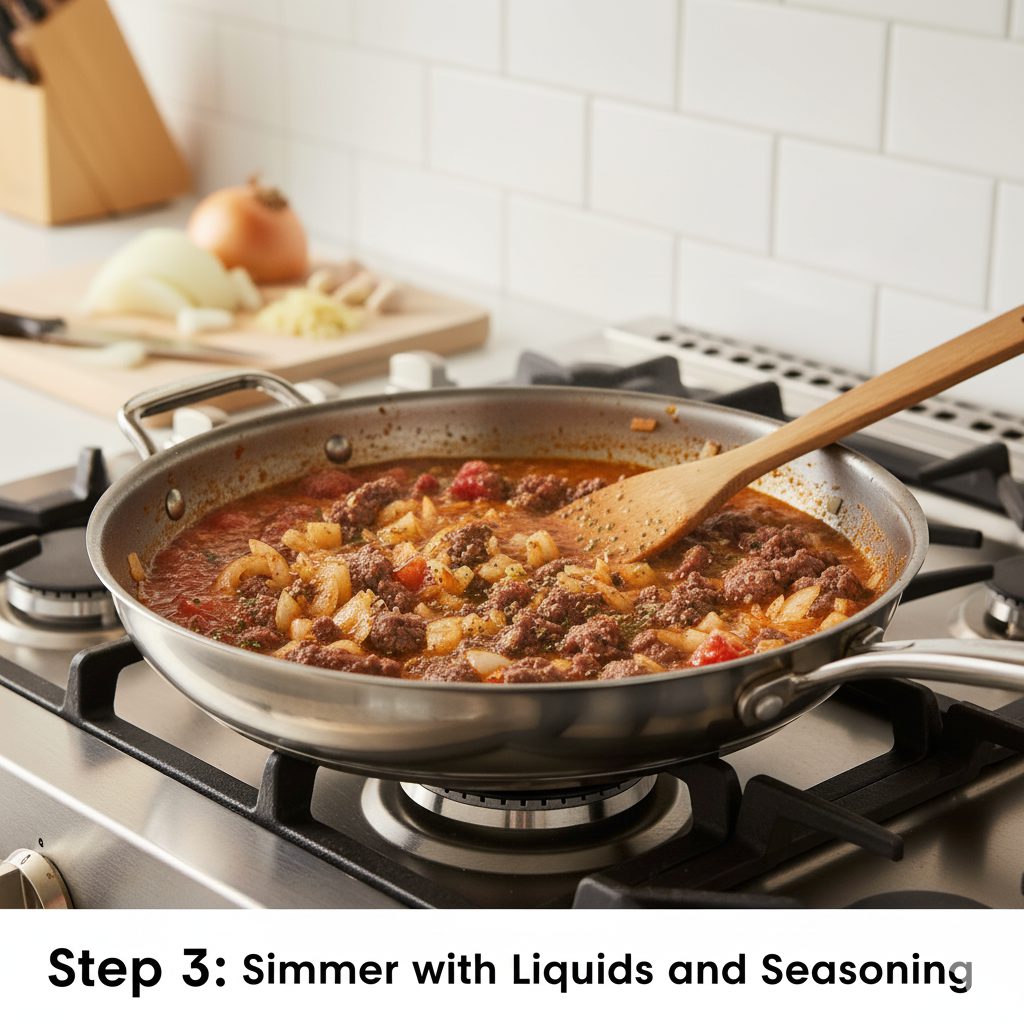 Create a space in the center of the pan for 2 cloves of minced garlic and cook briefly until you can smell them. Immediately sprinkle in your essential flavorings: 1 teaspoon of dried Italian herbs, 1/2 teaspoon of salt, and 1/4 teaspoon of black pepper. Stir the spices through the beef and onion mixture for 60 seconds. This brief moment in the heat wakes up the dried herbs. -