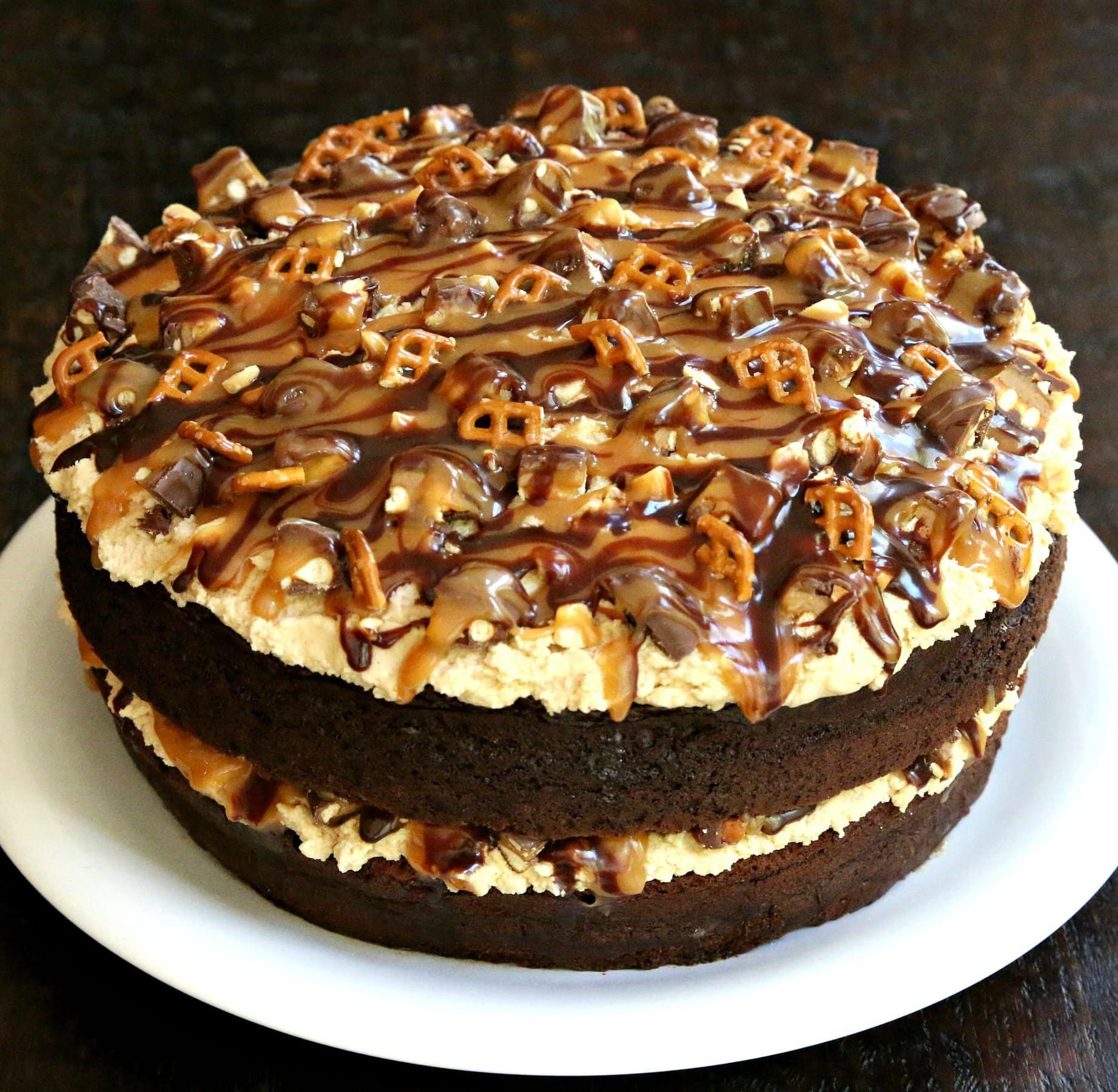 This indulgent cake layers rich chocolate cake with creamy peanut butter frosting, gooey caramel sauce, crunchy pretzel pieces, and roasted peanuts for the ultimate sweet-and-salty treat.