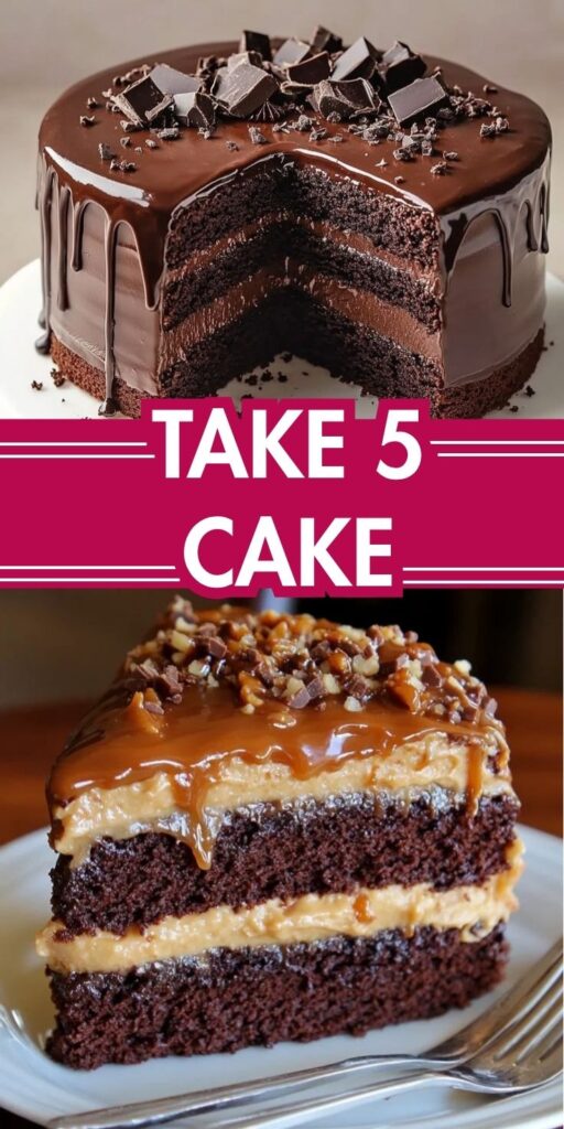 This cake is rich, so serve in smaller slices or even bake in cupcake tins for individual Take 5 cake bites—ideal for parties or potlucks.