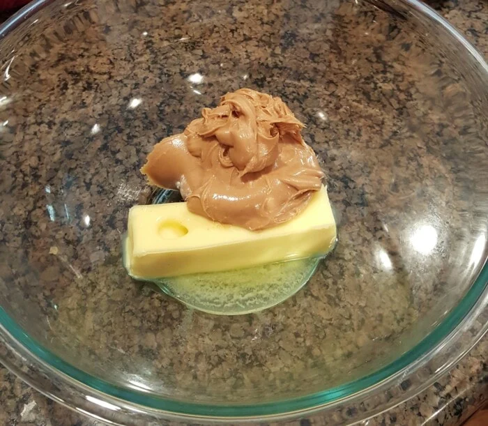 • In a large bowl, beat the peanut butter and softened butter together until smooth and fluffy.