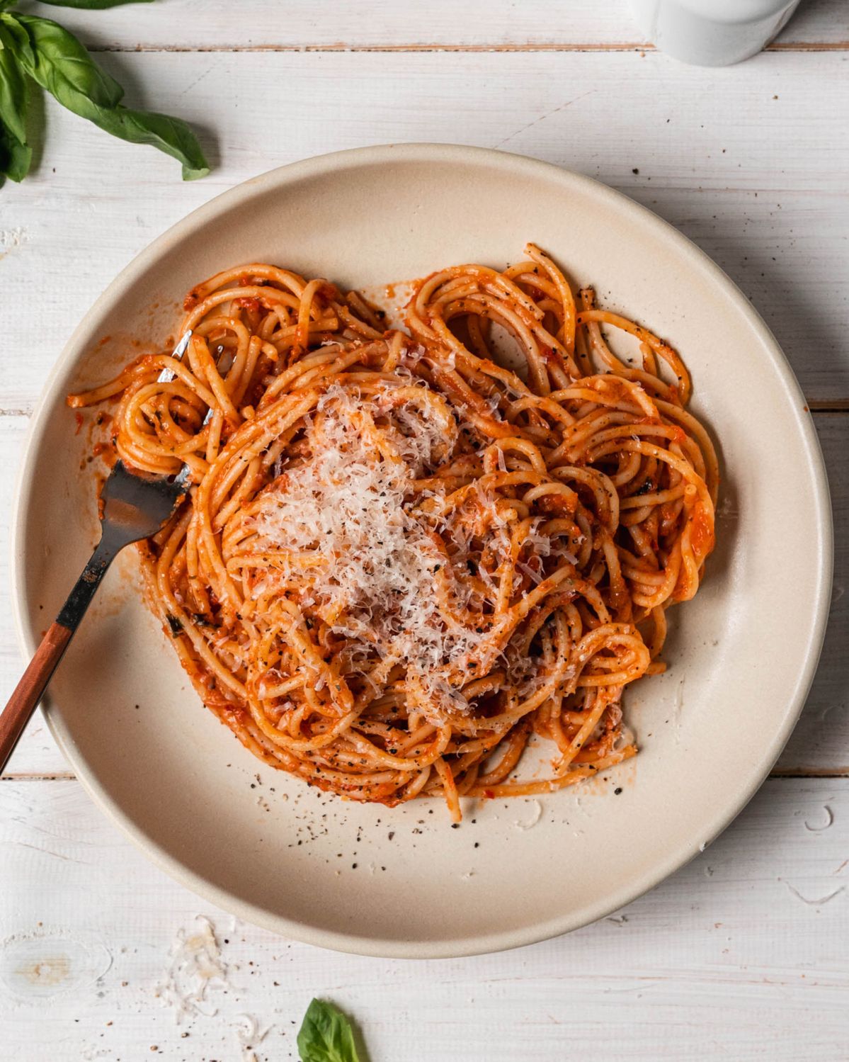 Warm your serving bowls before plating to keep the spaghetti at an ideal temperature until it’s eaten. - Highlight Fresh Garnishes