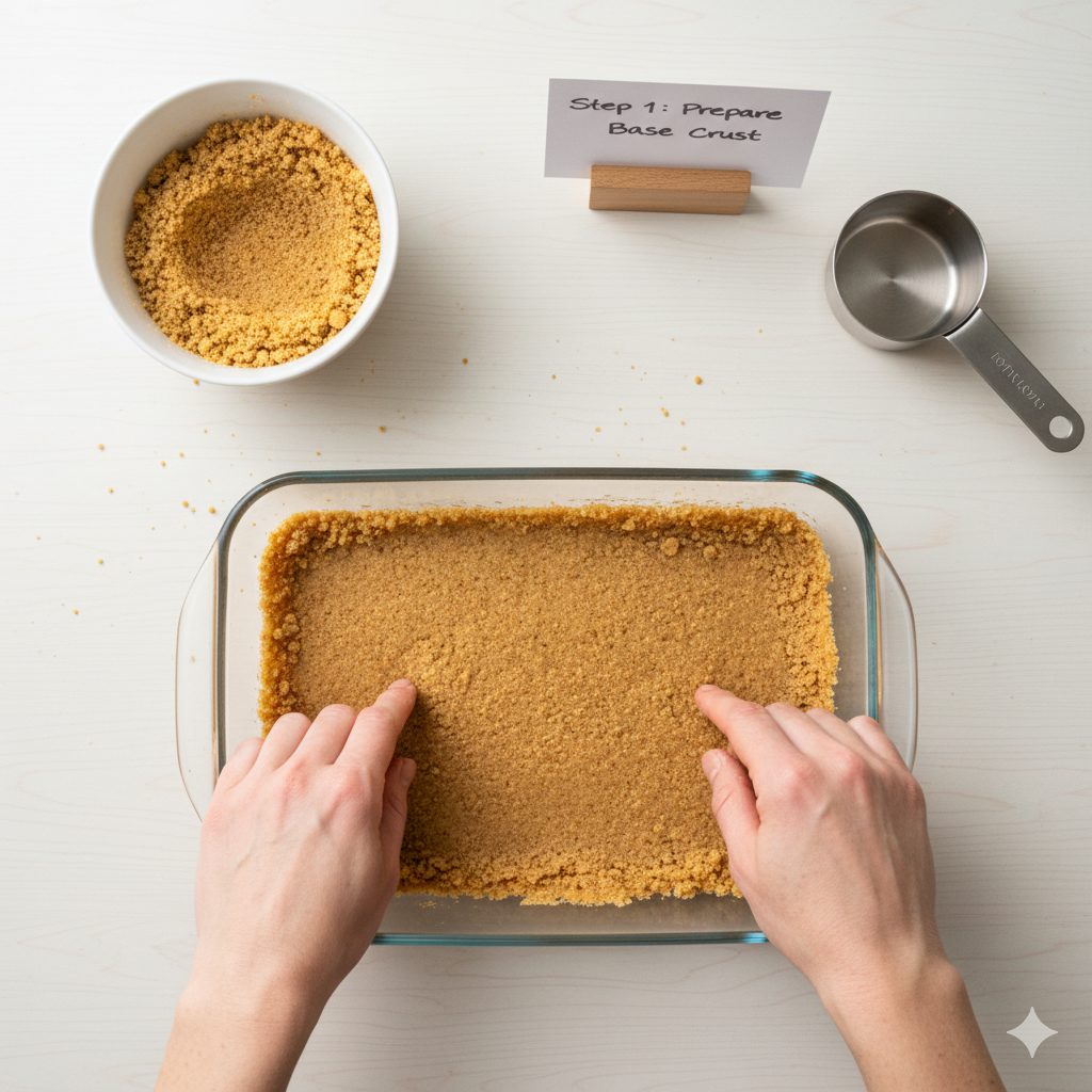 Firmly pack the crumb mixture across the base of the prepared pan. Employ a level-bottomed drinking glass or a flat-surface measuring utensil to achieve an even, densely compressed layer. Place the base in the oven and bake for fifteen minutes, or until a subtle, faint golden color appears around the perimeter.