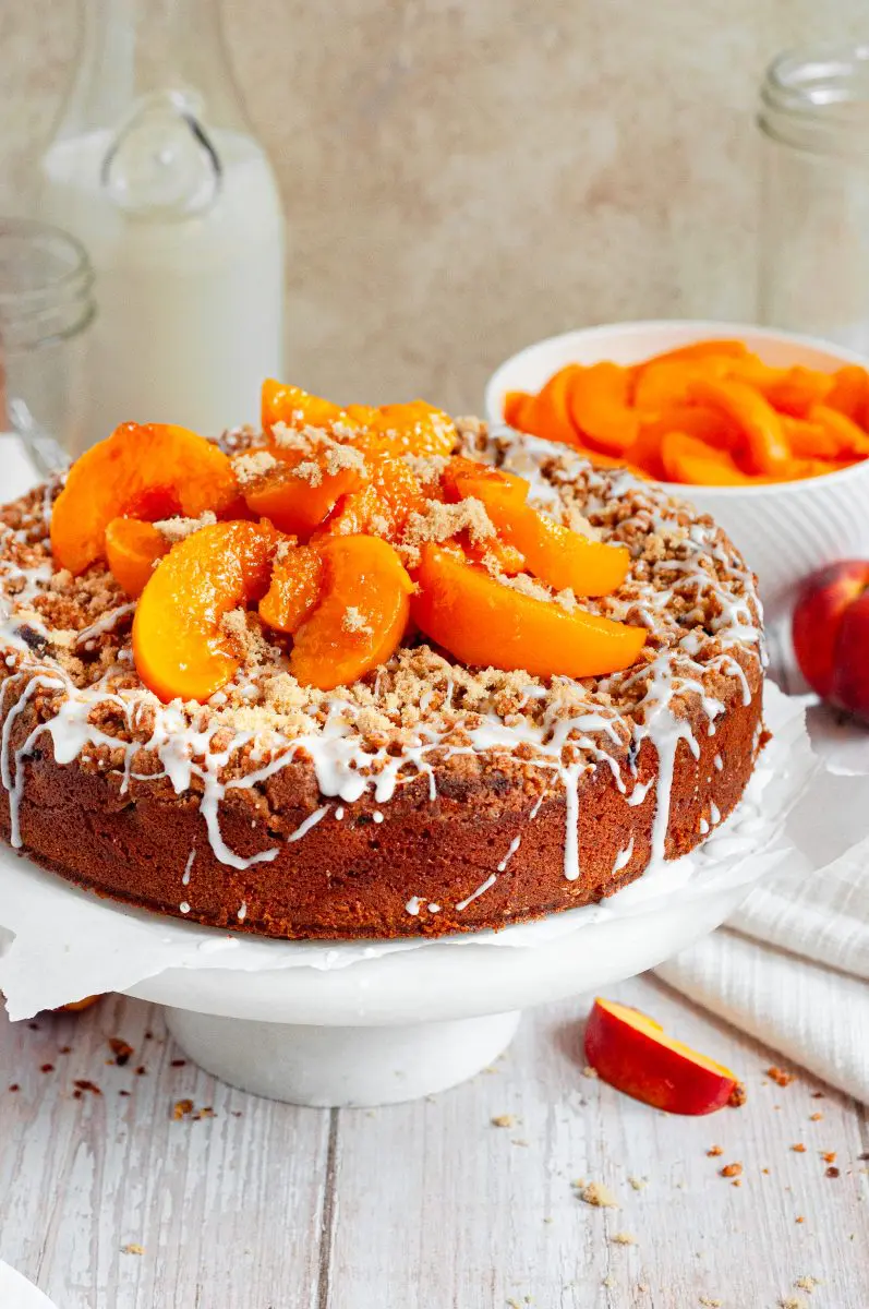 Vegan peach coffee cake is made without any animal-derived ingredients. Instead of eggs, recipes often use flaxseed meal, applesauce, or mashed banana as binders.